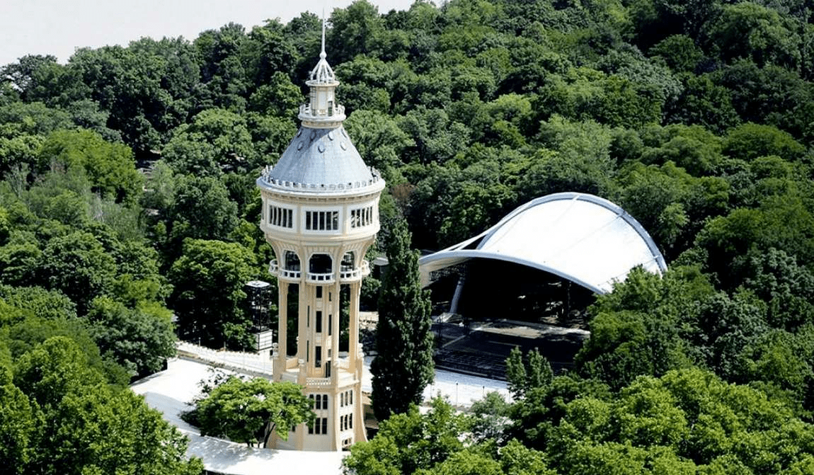 Над дивовижним ландшафтом острова помітно стару архітектурну споруду у стилі арт-нуво — водонапірну вежу. Раніше вона постачала термальною водою всю територію острова, а тепер це архітектурна пам’ятка. Вона була збудована у 1911 році за проєктом архітектора Вільмоша Резо. Мало хто знає, що це перша споруда в Угорщині, побудована із залізобетону. Висота вежі — 57 метрів.