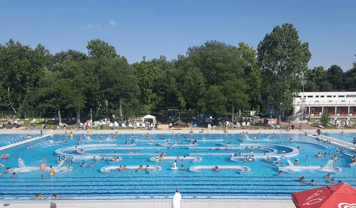 Роль пляжу виконує зелений газон. Відвідувачам подобається засмагати на траві під сонцем і в тіні біля дерев. Окрім басейнів, на пляжі є купальні з термальною водою.