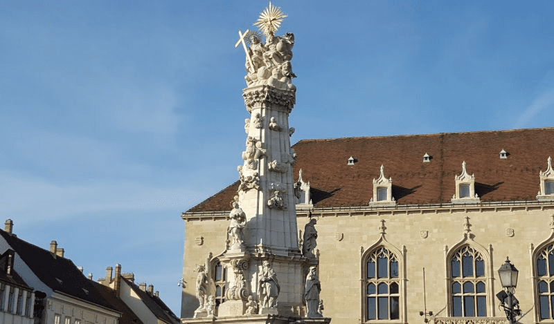 Прикладом тому є побудована колона Святої Трійці на честь вдячності Господу за те, що він припинив розповсюдження смертоносної епідемії. Проєкт меморіалу був затверджений у 1694 році міською радою Буди (Будапешту). Над її створенням протягом 6 років працював архітектор Церезола Верейо (Ceresola Verejo) та каменяр Бернат Феретті (Bernát Ferretti). Робота була готова у 1706 році, але у 1709 році мешканці Будапешту знову почали помирати в муках від чуми. Подальша доля пам’ятки була невтішною. Меморіал знесли, а на його місці спорудили новий, багатіший та гарніший. Ймовірно, забобонні мешканці стародавнього Будапешту думали, що попередній меморіал був не достатньо величний? І, може, саме тому розгніваний Господь повернув чуму в місто? В будь-якому разі свідомість людей тих далеких епох важко інтерпретувати на наш сучасний лад. Отже, над новим монументом працювали інші майстри. Це був скульптор Філіп Унглайх (Fülöp Ungleich) та каменяр Антал Хьоргер (Antal Hörger). «Античумна» колона була урочисто відкрита у 1713 році. Монумент є заввишки понад 14 метрів. Його прикрашають багато статуй, які уособлюють різних святих. Ця споруда, яка, до речі, сильно постраждала під час Другої світової війни, є нагадуванням про те, яким тендітним є людське життя.